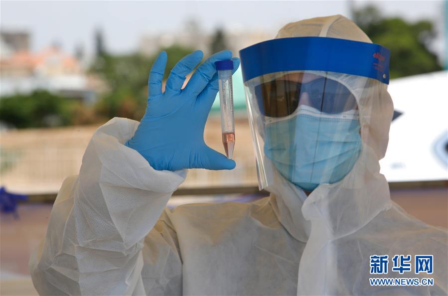 7月9日,在以色列中部城市卢德,医务人员手持新冠病毒检测样本。 以色列新冠疫情近期持续反弹。以色列卫生部9日晚发布数据,当天该国新增确诊病例1268例,累计确诊病例34825例。 新华社发(吉尔·科恩·马根摄)