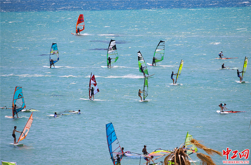 土耳其民众驾帆船冲浪休闲 彩色风帆点缀海滨