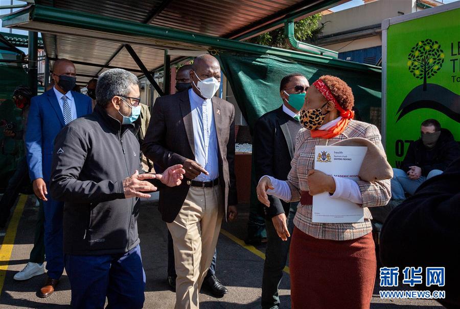 7月10日,南非卫生部长穆凯兹(中)来到比勒陀利亚一家医院视察。 根据7月9日的统计数据,南非新增新冠确诊病例13674例,累计238339例。 新华社发(耶希尔摄)