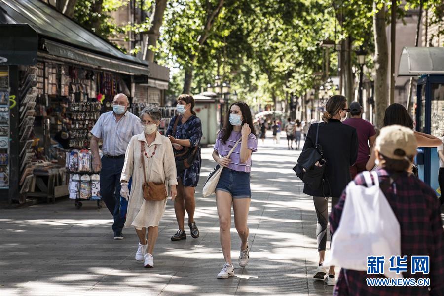 7月9日,在西班牙加泰罗尼亚自治区首府巴塞罗那,人们戴着口罩出行。 新华社发(巴塞罗那市政厅供图)