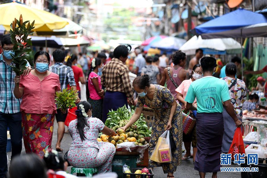 7月10日,人们在缅甸仰光一处露天市场购物。 近日,缅甸新冠疫情趋于稳定,受疫情影响严重的仰光已开始恢复往日生气。 新华社发(吴昂摄)