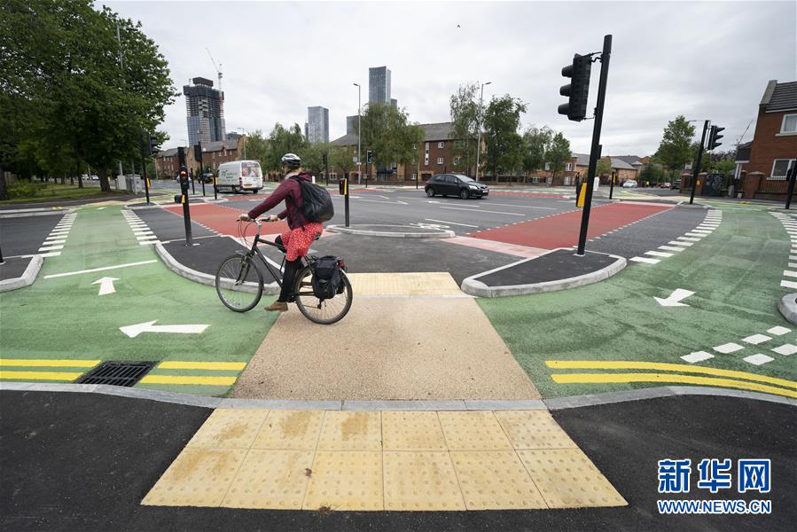 7月9日,在英国曼彻斯特,市民骑车在自行车道通行。新华社发(乔恩·休珀摄)