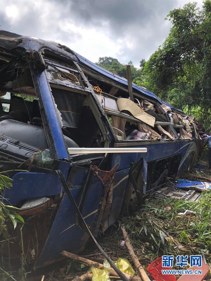 这是7月11日在越南中部的昆嵩省拍摄的客车坠谷事故现场。 越南中部的昆嵩省11日发生一起客车坠入山谷事故,造成至少5人死亡、35人受伤。 新华社/越通社