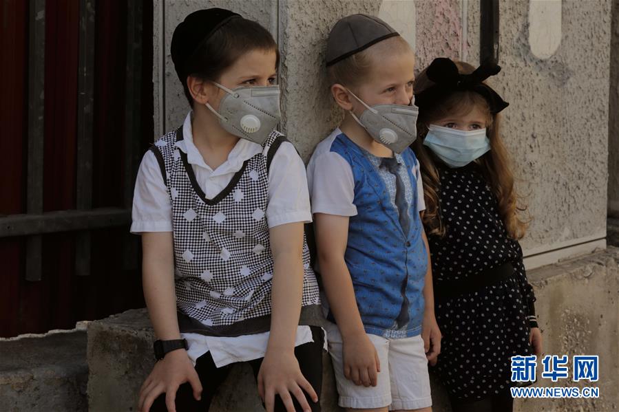 这是7月10日在耶路撒冷一处被封锁的社区拍摄的戴口罩的儿童。新华社发(吉尔·科恩·马根摄)
