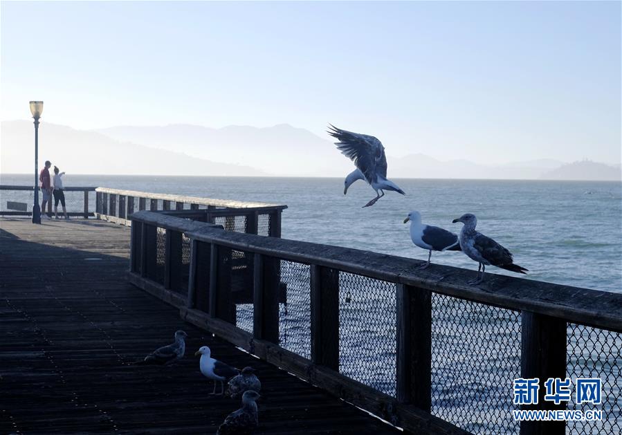 7月12日,游客在美国旧金山的渔人码头观赏风景。 受新冠疫情影响,美国旧金山知名景点渔人码头上的大部分旅游商业设施和店铺暂时关闭。 新华社发