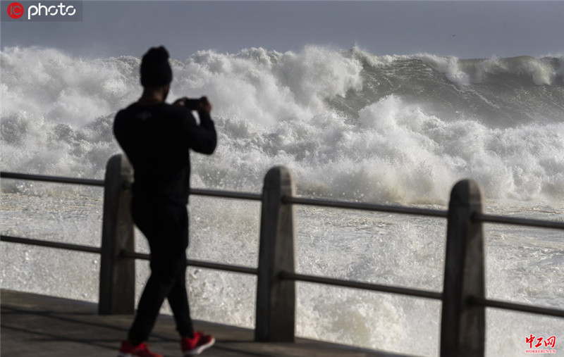 当地时间2020年7月13日,南非开普敦,受冷锋影响当地遭强风暴袭击,掀起的巨浪冲上海岸,街道也因此形成了延绵数里的海水泡沫奇观,酷似茫茫大雪覆盖道路。