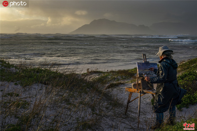 当地时间2020年7月13日,南非开普敦,受冷锋影响当地遭强风暴袭击,掀起的巨浪冲上海岸,街道也因此形成了延绵数里的海水泡沫奇观,酷似茫茫大雪覆盖道路。图为一名艺术家在风暴中画画。