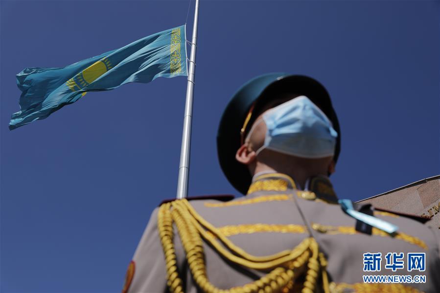 7月13日,哈萨克斯坦首都努尔苏丹一纪念公园降半旗志哀。 2020年7月13日是哈萨克斯坦全国哀悼日。当地时间12时整,哈全国默哀一分钟,哀悼因新冠肺炎病逝的该国公民。 新华社发(奥斯潘诺夫摄)