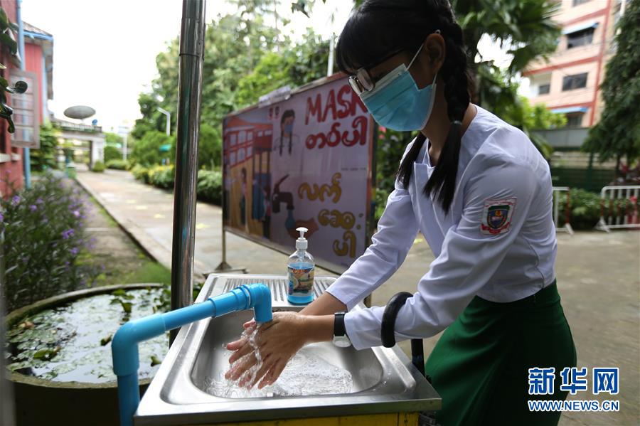 7月13日,前来报到的学生在缅甸仰光一所学校内清洁双手。 缅甸高中生于当日返校报到。 新华社发(吴昂摄)