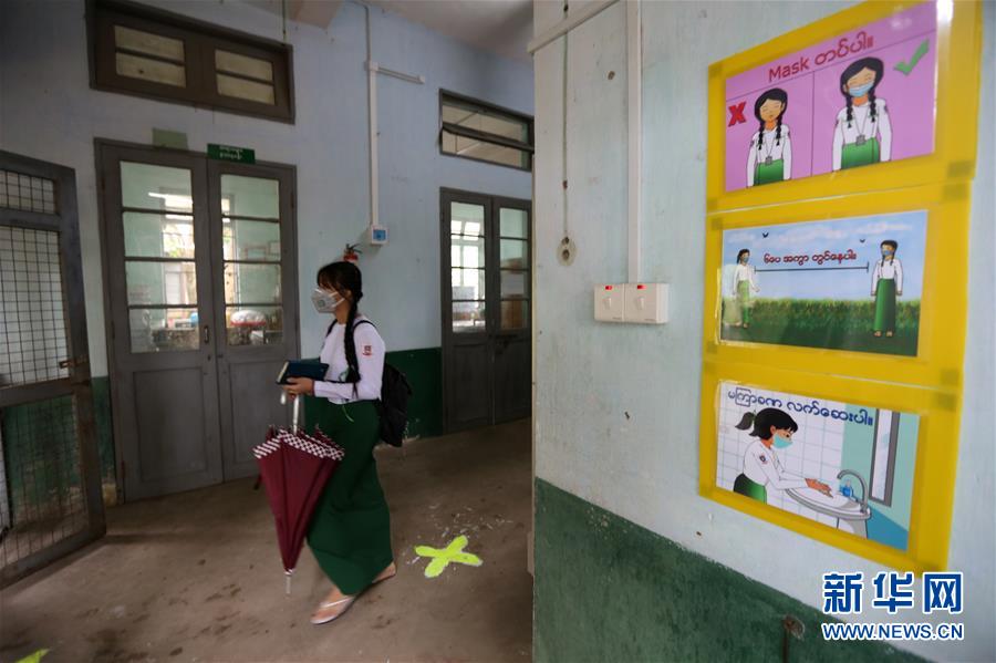 7月13日,缅甸仰光一所学校的墙壁上贴着防疫宣传画。 缅甸高中生于当日返校报到。 新华社发(吴昂摄)