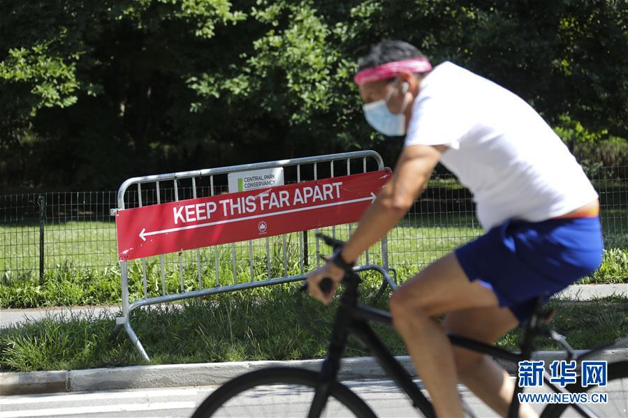 7月13日,在美国纽约中央公园,一名男子骑车经过保持社交距离的告示。