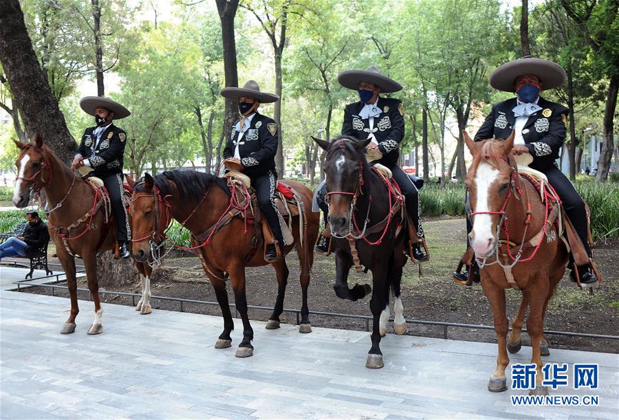 7月13日,墨西哥首都墨西哥城的骑警戴着口罩执勤。 墨西哥卫生部13日晚公布的新冠疫情数据显示,过去24小时新增确诊病例4685例,累计确诊病例304435例。 新华社发(费尔南多·卡马乔摄)