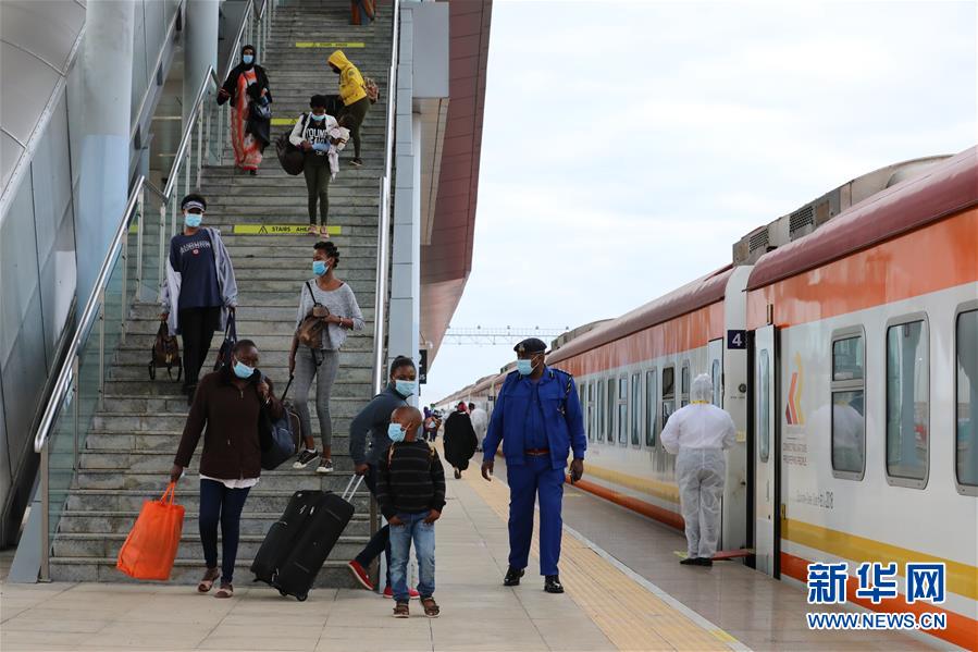 7月13日,在位于肯尼亚内罗毕的蒙内铁路内罗毕站,乘客准备乘车。 因新冠疫情停运97天的肯尼亚蒙内铁路客运列车13日恢复运行。 新华社发(冯东 摄)