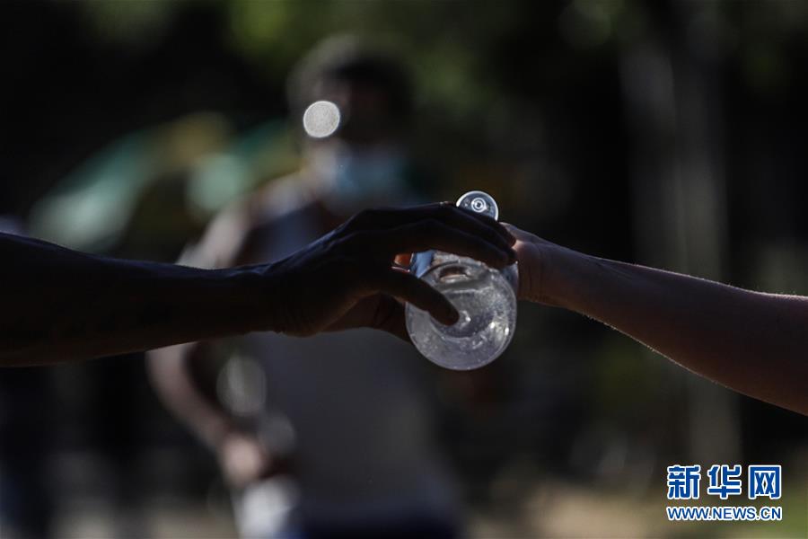7月13日,在巴西圣保罗市重新开放的伊比拉普埃拉公园内,工作人员为游客提供酒精凝胶。 新华社发(拉赫尔·帕特拉索摄)