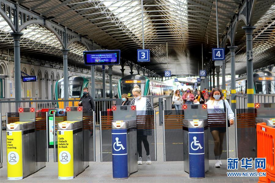7月13日,人们戴着口罩在爱尔兰都柏林的一个火车站出行。 爱尔兰规定,从7月13日起人们乘坐公共交通工具必须戴口罩,违规者将面临2500欧元罚金或半年徒刑。 新华社发