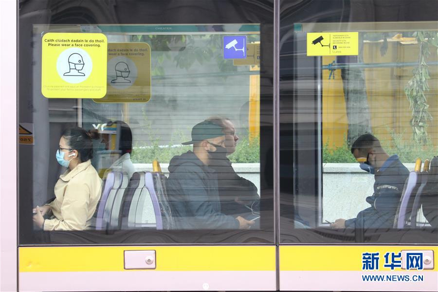 7月13日,人们戴着口罩在爱尔兰都柏林乘坐有轨电车。 爱尔兰规定,从7月13日起人们乘坐公共交通工具必须戴口罩,违规者将面临2500欧元罚金或半年徒刑。 新华社发