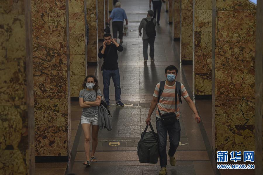 7月13日,人们戴着口罩走在俄罗斯莫斯科一个地铁站内。 据俄防疫指挥部14日消息,俄罗斯过去24小时新增新冠确诊病例6248例,累计确诊739947例;新增死亡病例175例,累计死亡11614例。 新华社发(叶甫盖尼·西尼岑摄)