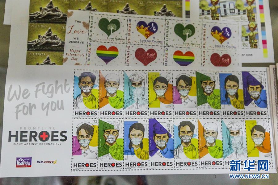 这是7月14日在菲律宾首都马尼拉拍摄的新发行的抗疫邮票。邮票设计图案包括医务人员、军人、警察、超市工作人员等。 菲律宾邮政公司近日发行特别邮票,将奋战在一线的抗疫人员描绘为“英雄”,向他们致敬。 新华社发(乌马利 摄)