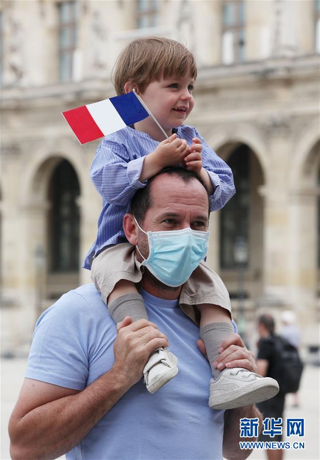 7月14日,在法国巴黎卢浮宫玻璃金字塔广场,一对父子观看国庆阅兵式的飞行表演。 新华社记者 高静 摄