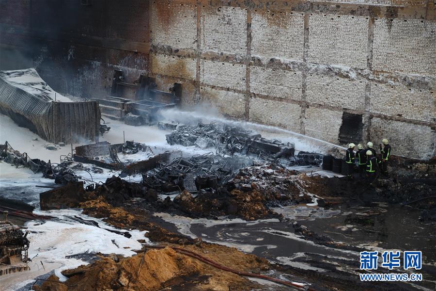 7月14日,消防员在埃及开罗的原油管道破裂起火现场灭火。新华社发(艾哈迈德·戈马摄)