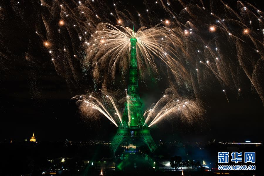 7月14日,庆祝国庆日的烟花在法国巴黎埃菲尔铁塔附近绽放。 当天是法国国庆日。埃菲尔铁塔传统烟花秀当晚照常举行,但出于防疫考虑,市民只能在家中观看电视转播。 新华社发(奥雷利安·莫里萨尔摄)