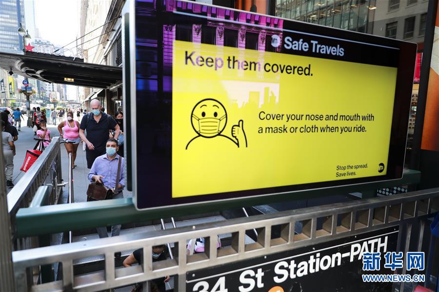 7月14日,人们佩戴口罩进入美国纽约地铁站。 美国约翰斯·霍普金斯大学:截至北京时间15日6时34分,全球新冠确诊病例达13258016例,死亡病例为576752例。美国是全球疫情最严重的国家,确诊病例达3416222例,死亡病例为136319例。 新华社记者 王迎 摄