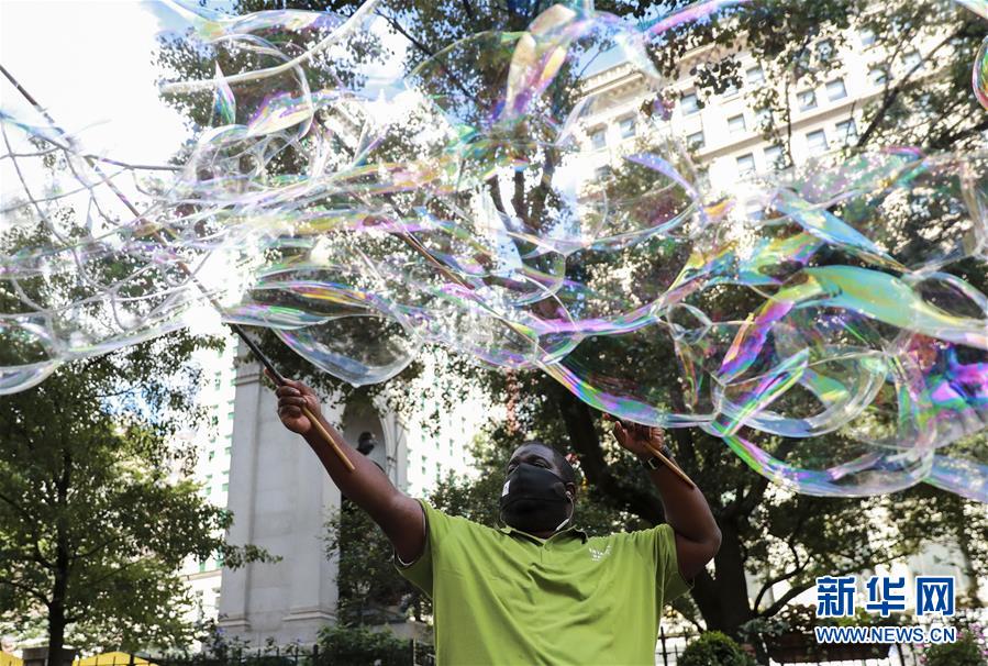 7月14日,美国纽约街头一名戴口罩的男子表演“泡泡秀”。 美国约翰斯·霍普金斯大学:截至北京时间15日6时34分,全球新冠确诊病例达13258016例,死亡病例为576752例。美国是全球疫情最严重的国家,确诊病例达3416222例,死亡病例为136319例。 新华社记者 王迎 摄