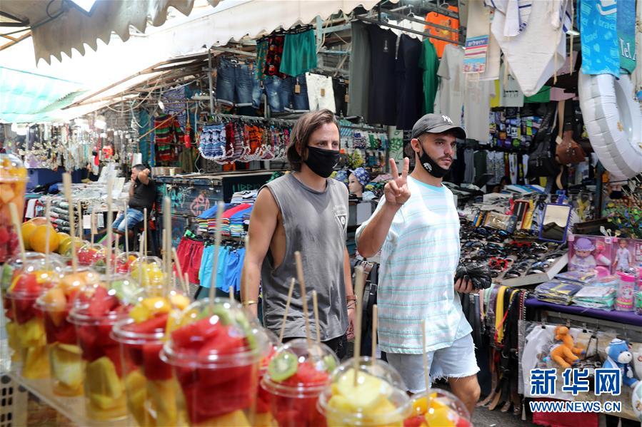 7月14日,两名男子行走在以色列中部城市特拉维夫一处市场。 以色列卫生部14日晚公布数据,当天该国新增确诊病例1728例,累计确诊42360例;新增死亡6例,累计死亡371例;新增治愈270例,累计治愈19665例。以色列内阁当天举行紧急会议,讨论进一步采取限制措施应对持续蔓延的疫情,不过会议未能作出任何决定。 新华社/基尼图片社
