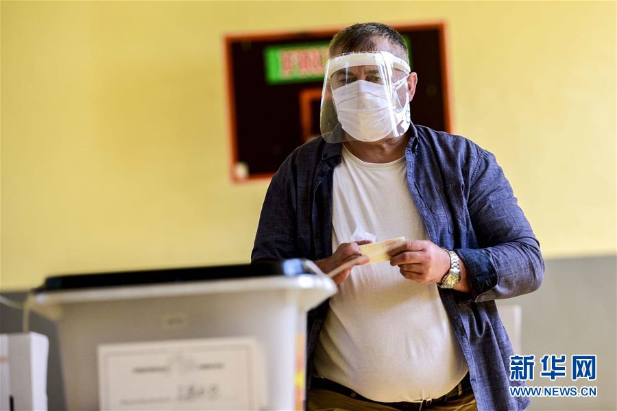 7月15日,选民在北马其顿首都斯科普里一投票站准备投票。 当日,北马其顿举行议会选举。北马其顿议会选举原定于4月12日提前举行,但受新冠疫情影响被迫推迟。 新华社发(托米斯拉夫·格奥尔基耶夫摄)