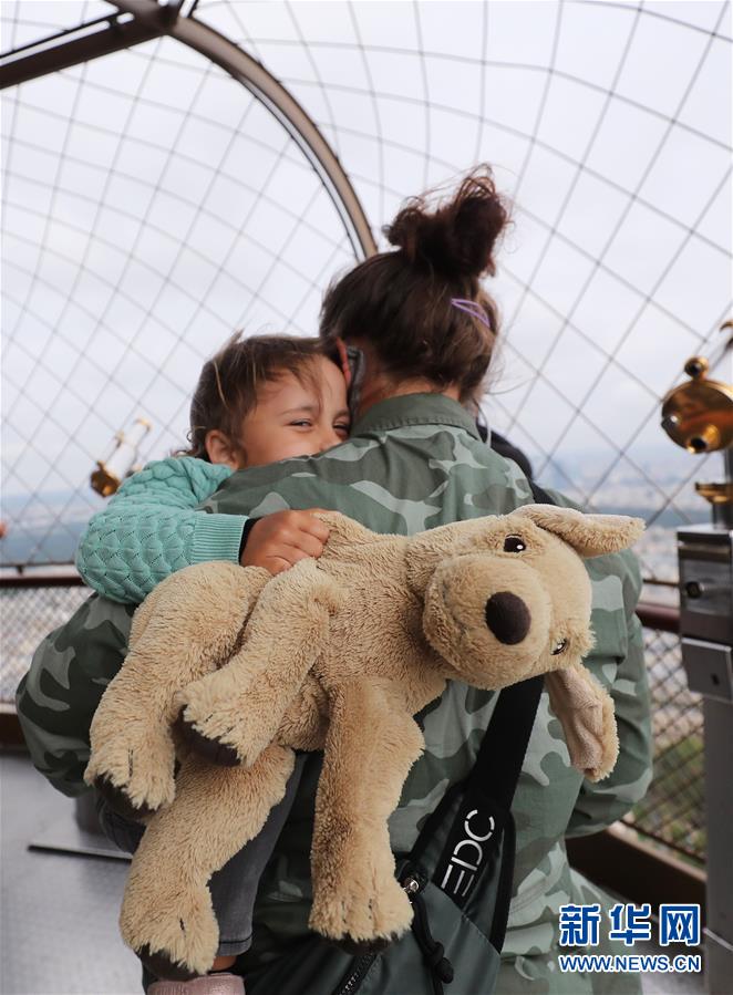 7月15日,一对母子在法国巴黎埃菲尔铁塔顶层观景平台参观。 新华社记者 高静 摄
