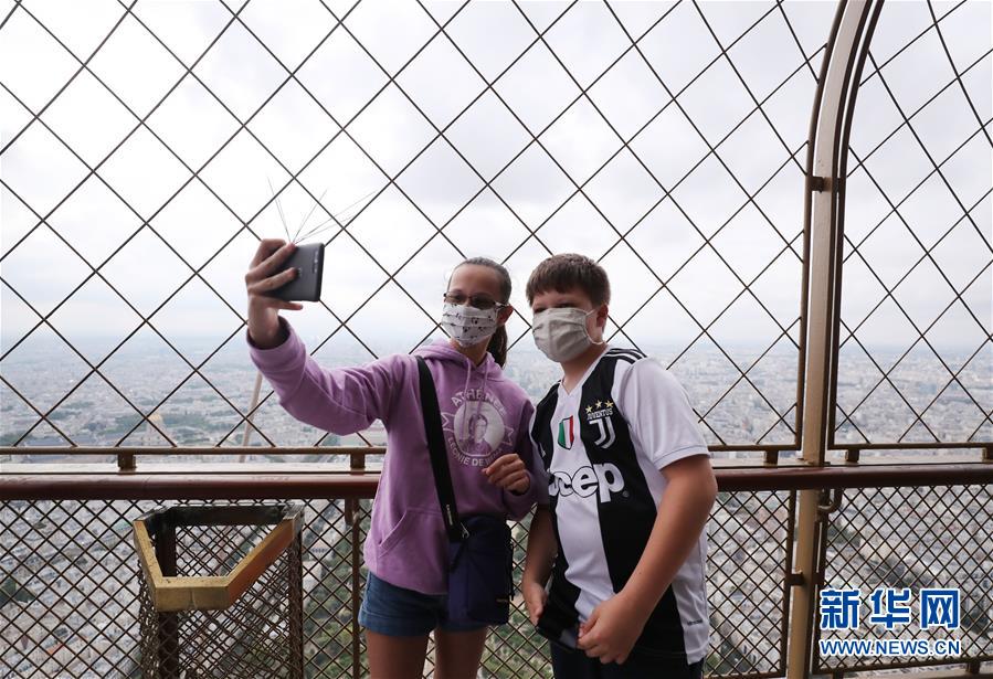 7月15日,两名小游客在法国巴黎埃菲尔铁塔顶层观景平台自拍留念。 新华社记者 高静 摄