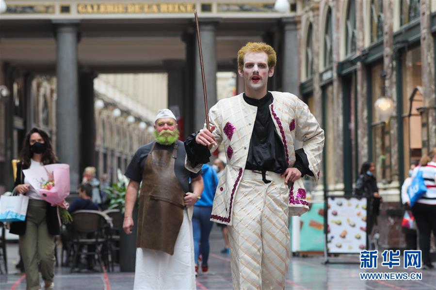 7月15日,参加"格子游戏"的戏剧艺术家走在比利时布鲁塞尔市中心的圣于贝尔长廊。 新华社记者 郑焕松 摄