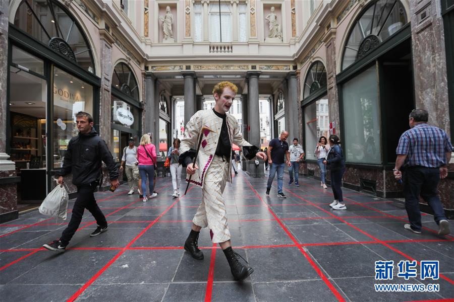 7月15日,戏剧艺术家在比利时布鲁塞尔市中心与过往的人们互动“格子游戏”。 新华社记者 郑焕松 摄