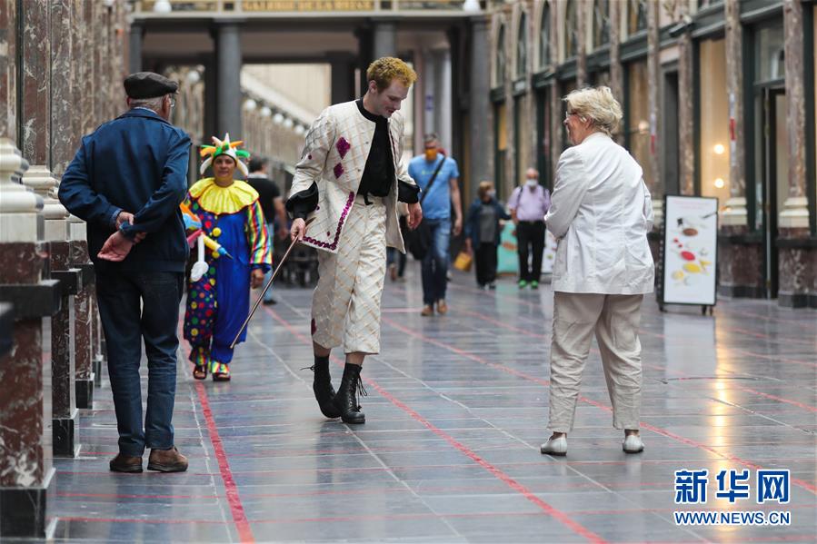 7月15日,戏剧艺术家在比利时布鲁塞尔市中心与过往的人们互动“格子游戏”。 新华社记者 郑焕松 摄