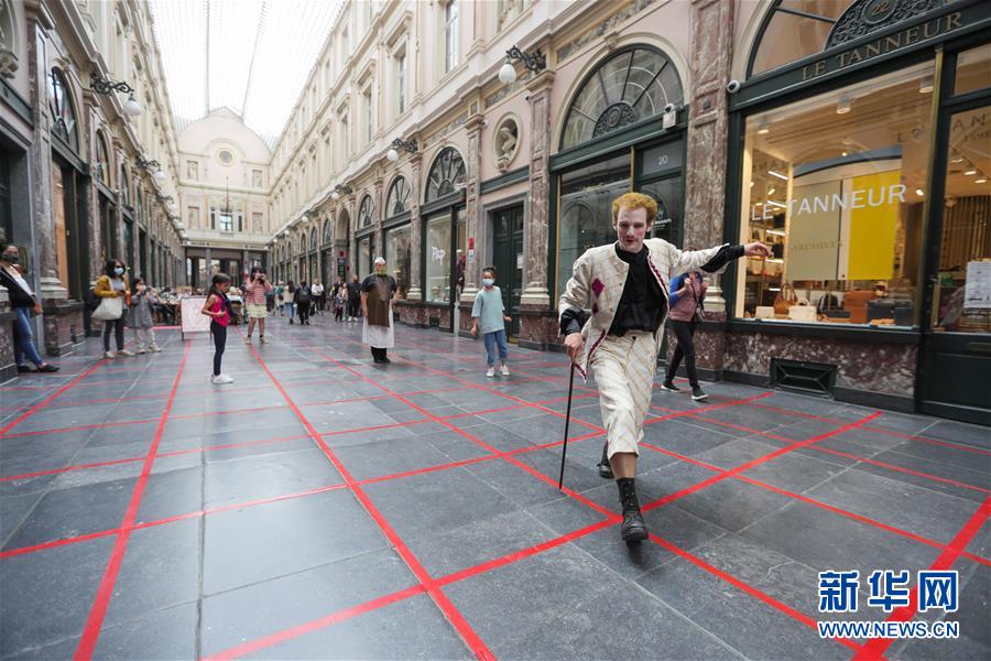 7月15日,戏剧艺术家在比利时布鲁塞尔市中心与过往的人们互动“格子游戏”。 新华社记者 郑焕松 摄