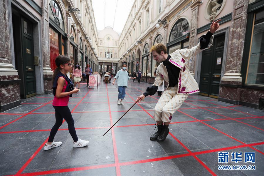 7月15日,戏剧艺术家在比利时布鲁塞尔市中心与一名女孩互动“格子游戏”。 新华社记者 郑焕松 摄