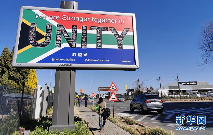 7月15日,南非约翰内斯堡路边一处广告牌上写着“我们紧紧团结在一起”的抗疫标语。 南非卫生部15日公布的数据显示,南非新增新冠确诊病例12757例,累计311049例,约占非洲病例总数的一半。 新华社记者 陈诚 摄