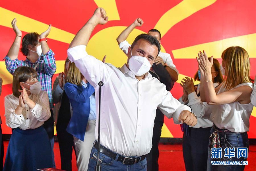 7月16日,在北马其顿首都斯科普里,马其顿社会民主联盟领导人佐兰·扎埃夫(中)庆祝选举胜利。 北马其顿执政的马其顿社会民主联盟16日宣布在前一天举行的议会选举中获胜。 新华社发(托米斯拉夫·格奥尔基耶夫摄)