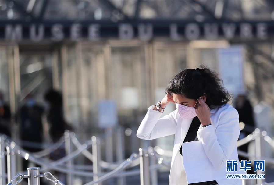7月6日,一名女子在进入法国巴黎卢浮宫博物馆前戴上口罩。 新华社记者高静摄