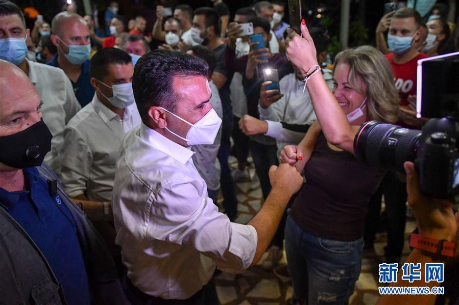 7月16日,在北马其顿首都斯科普里,马其顿社会民主联盟领导人佐兰·扎埃夫(中)庆祝选举胜利。 北马其顿执政的马其顿社会民主联盟16日宣布在前一天举行的议会选举中获胜。 新华社发(托米斯拉夫·格奥尔基耶夫摄)
