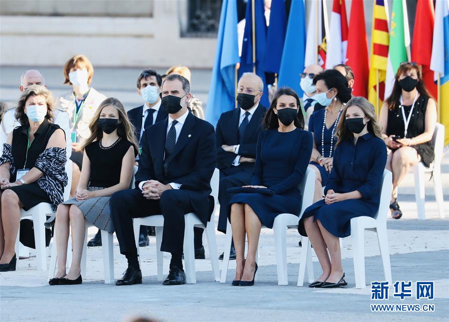 7月16日,西班牙国王费利佩六世(前右三)等王室成员在首都马德里参加国家纪念仪式。 西班牙16日在马德里举行国家纪念仪式,追思和哀悼新冠疫情病亡者。 新华社发