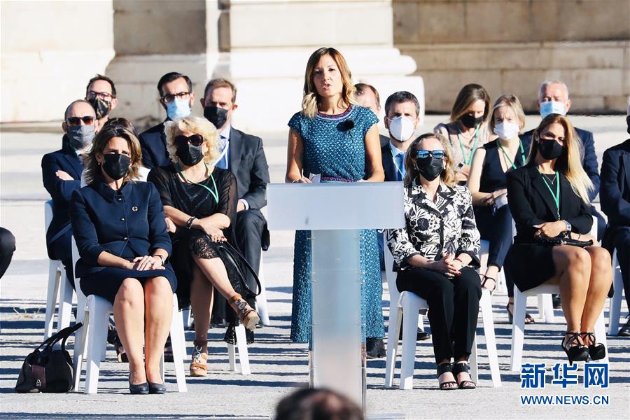 7月16日,西班牙医护人员代表、巴塞罗那希伯伦山谷医院护士阿罗亚·洛佩斯(前)在首都马德里举行的国家纪念仪式上致辞。 西班牙16日在马德里举行国家纪念仪式,追思和哀悼新冠疫情病亡者。 新华社发