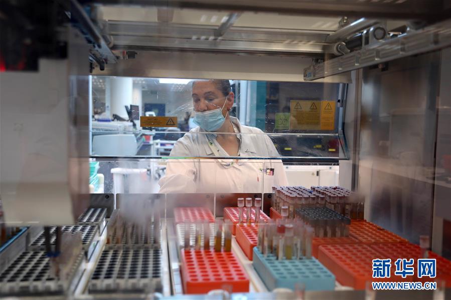 7月16日,在以色列中部城市奥尔耶胡达的一家实验室,工作人员对血液样本进行检测。 以色列卫生部16日晚公布的数据显示,当天新增新冠确诊病例1871例,累计确诊46059例,累计死亡384例,累计治愈20370例。 新华社/基尼图片社