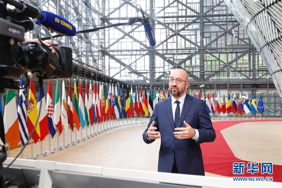 7月17日,欧洲理事会主席米歇尔抵达位于比利时布鲁塞尔的欧盟总部时讲话。新华社发(欧盟供图)