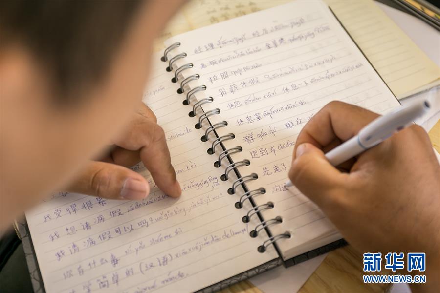 7月15日,在老挝首都万象的老挝国立大学孔子学院,一名中老铁路老挝籍学员学习汉字。新华社发(凯乔摄)