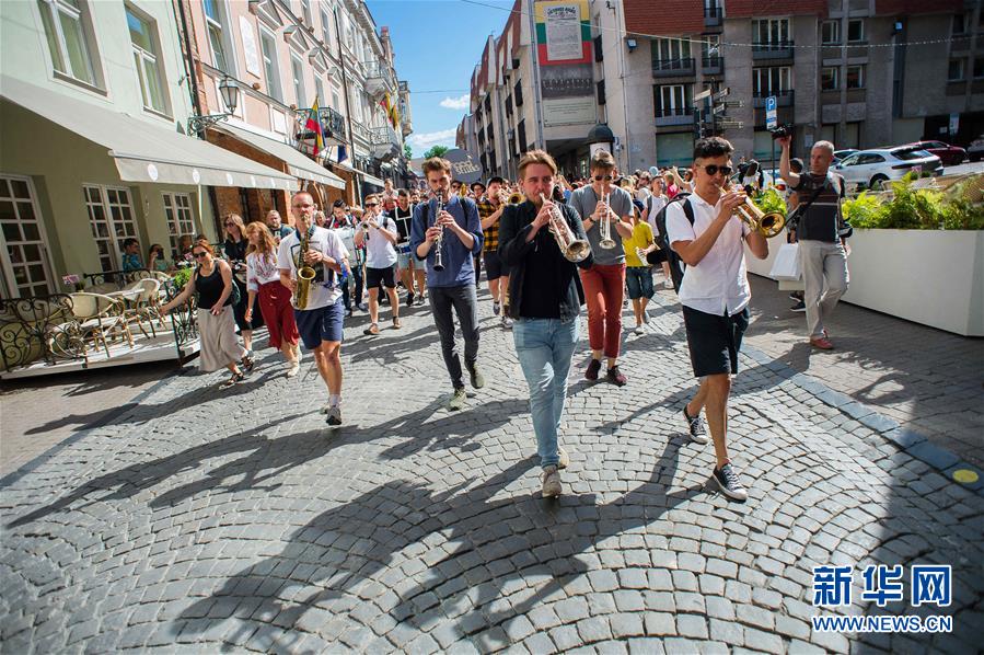 7月18日,在立陶宛首都维尔纽斯,乐手在街头表演。 新华社发(阿尔弗雷达斯·普里亚迪斯摄)