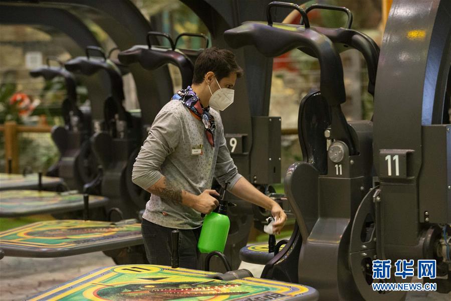 7月18日,在俄罗斯首都莫斯科的“梦之岛”游乐园,工作人员对游乐设施消毒。 当日,受新冠疫情影响关闭数月的“梦之岛”游乐园恢复对公众开放。 新华社发(亚历山大摄)
