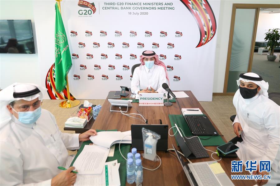 7月18日,在沙特阿拉伯利雅得,沙特金融管理局局长艾哈迈德·胡利费(左)和沙特财政大臣穆罕默德·贾丹(中)出席二十国集团财长和央行行长视频会议。 二十国集团财长和央行行长18日举行视频会议,承诺继续采取一切可用的政策工具,支持全球经济复苏。今年4月15日,二十国集团财长和央行行长举行视频会议,讨论通过了二十国集团“暂缓最贫困国家债务偿付倡议”,一致同意暂缓有关国家今年5月1日至年底到期的债务本息偿付。 新华社发(沙特新闻部供图)