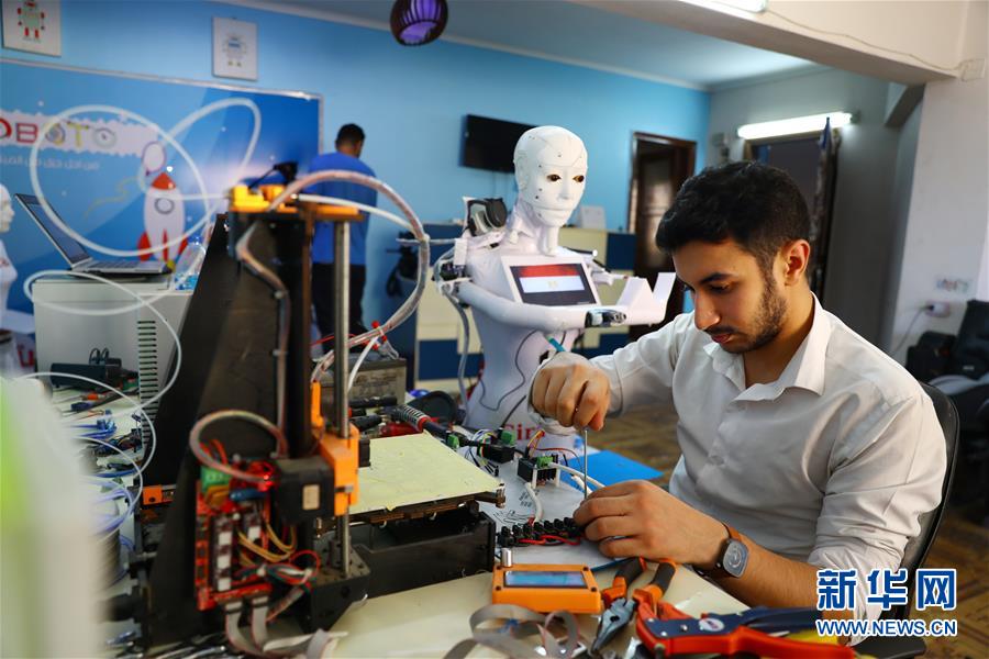 7月17日,在埃及北部城市坦塔,埃及工程师马哈茂德·科米在实验室内测试机器人。 这台名叫Cira 02的机器人由埃及工程师马哈茂德·科米开发,可以进行新冠病毒的检测。 新华社发(艾哈迈德·戈马 摄)