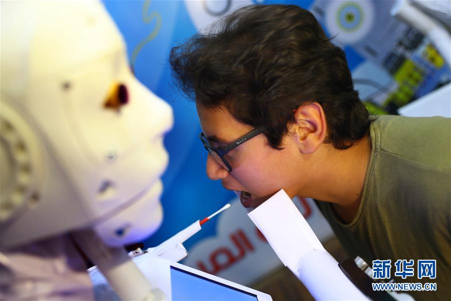 7月17日,在埃及北部城市坦塔,一名男子通过Cira 02机器人进行检测取样。 这台名叫Cira 02的机器人由埃及工程师马哈茂德·科米开发,可以进行新冠病毒的检测。 新华社发(艾哈迈德·戈马 摄)